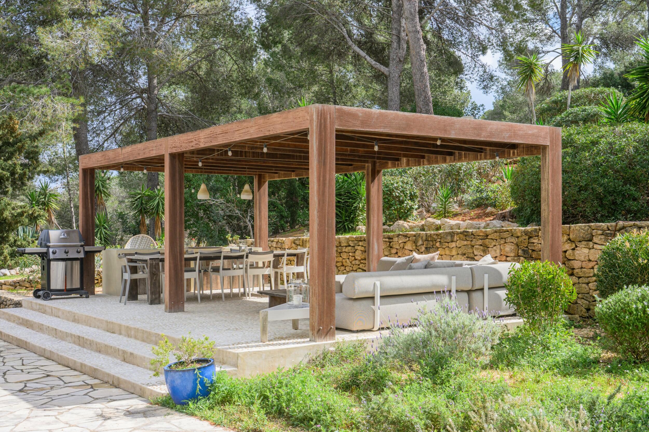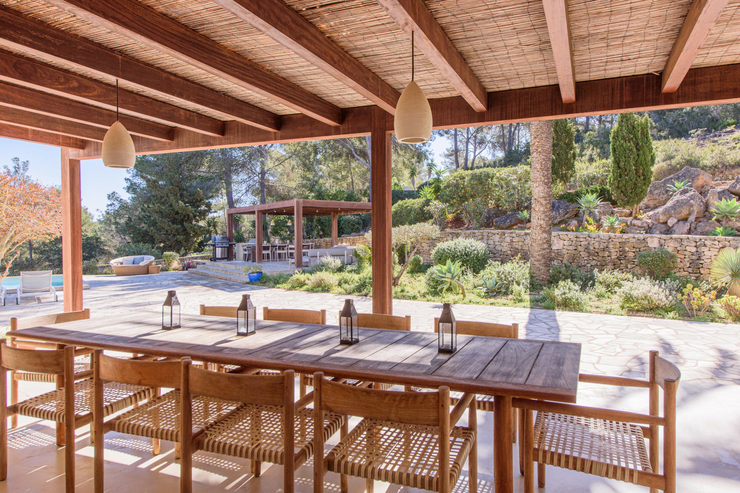 La propriété, entourée de pins, bénéficie d'un bel extérieur, méticuleusement entretenu et entièrement clôturé. Le jardin irrigué automatiquement est plein de végétation, y compris des pelouses, quelques arbres fruitiers et de beaux cyprès. Elle dispose également d'une grande piscine rectangulaire, d'un barbecue/cuisine extérieure, de plusieurs terrasses couvertes et non couvertes pour se détendre et d'une terrasse sur le toit avec bar et espace chill-out auquel on accède par des escaliers extérieurs.