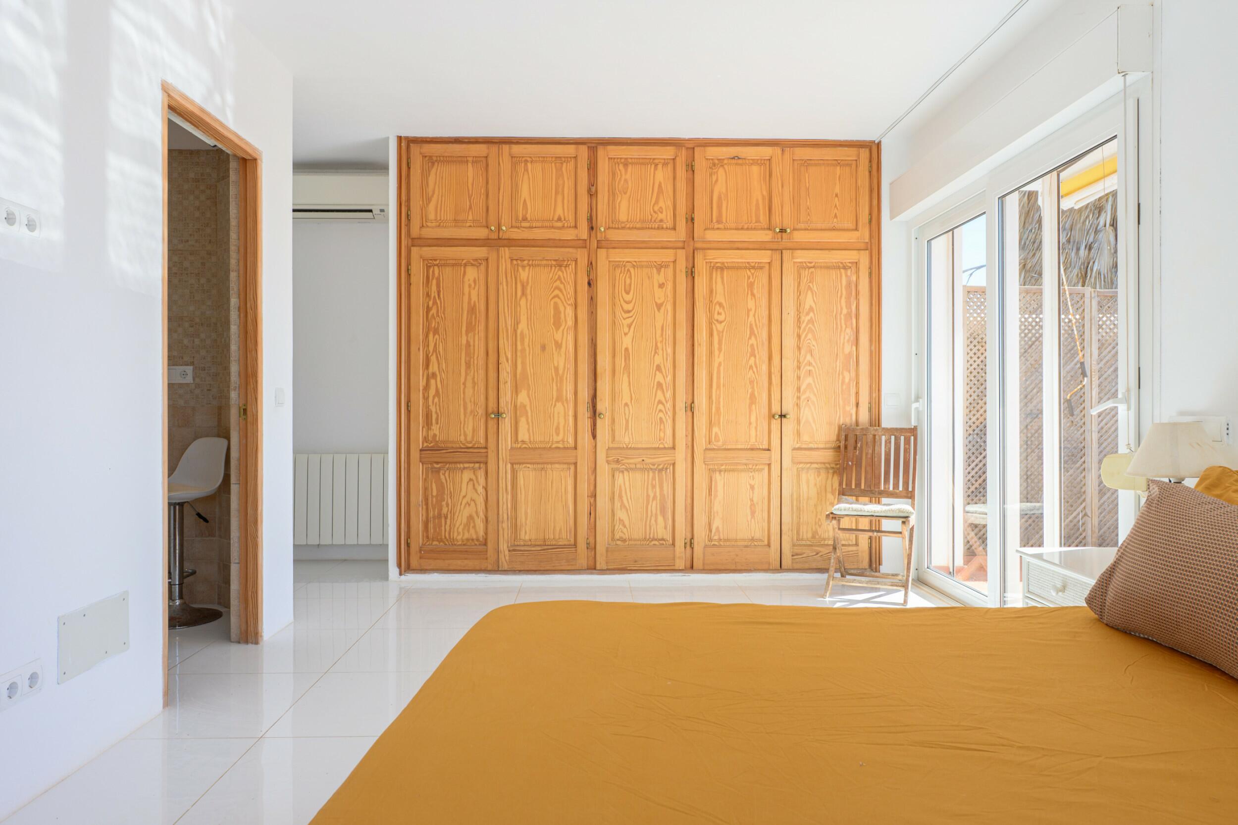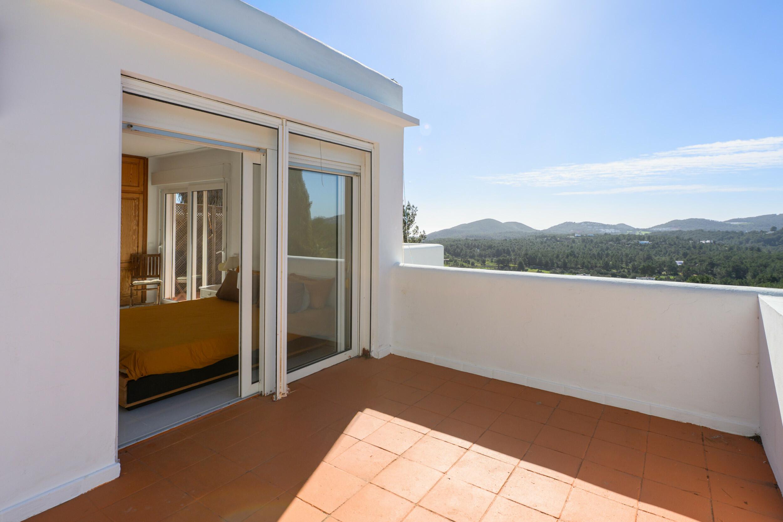 Le premier étage comprend un total de quatre chambres doubles avec salle de bains, dont une avec un accès direct à une terrasse qui mène au toit. Un couloir spacieux avec un espace bureau intégré ajoute à la fonctionnalité de ce niveau. La plus remarquable est la spacieuse suite parentale, qui dispose de sa propre cheminée, d'un balcon privé, de vues sur Dalt Vila, d'une luxueuse salle de bains en-suite avec baignoire et douche, et d'un généreux dressing. Elle offre également un accès direct à une chambre double supplémentaire avec salle de bains privative, idéale pour une chambre d'enfant, un bureau privé ou un logement d'invité.