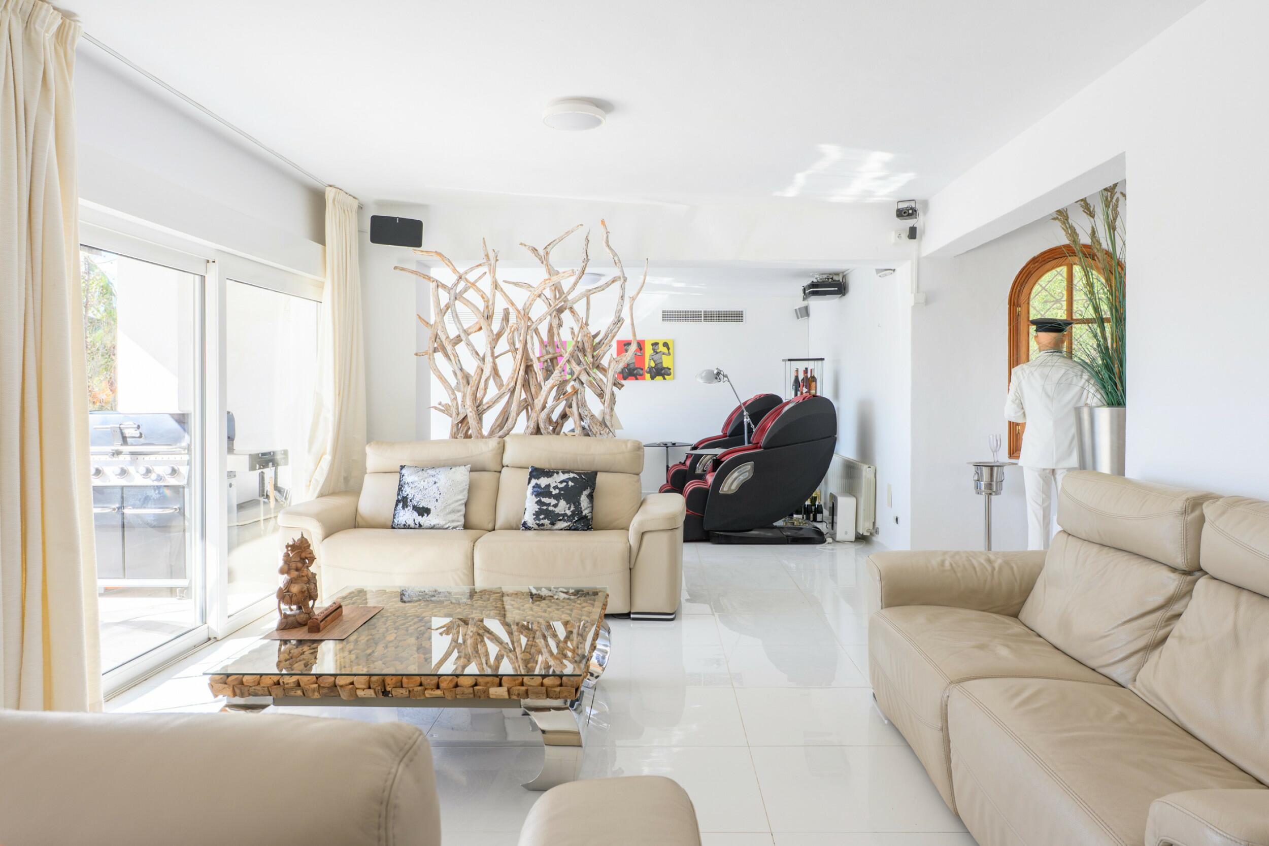 L'espace extérieur dispose d'une variété d'installations de loisirs et de bien-être, notamment une piscine spacieuse de 120 m² entourée de pelouses verdoyantes et de nombreux palmiers, un jacuzzi climatisé, un terrain de volley-ball, une aire de football pour enfants, un grand trampoline et une plate-forme de yoga tranquille. Un potager bien entretenu et une cabane à outils s'ajoutent à la verdure vibrante, qui comprend 90 oliviers (pour la production privée d'huile d'olive) et plusieurs orangers. Le pavillon est la pièce maîtresse de la propriété. Il comprend une cuisine extérieure entièrement équipée avec trois réfrigérateurs, deux lave-vaisselle, une plaque à induction (avec raccordement au gaz disponible), un four à pizza/pain, un barbecue et un cuiseur à paella. Cet espace est idéal pour les repas en plein air et comprend actuellement une salle de sport extérieure, un espace de ping-pong et une salle de bains extérieure. Il y a également un espace de stockage dédié pour l'équipement de plage, et plusieurs citernes sous le pavillon assurent une gestion efficace de l'eau pour le domaine.