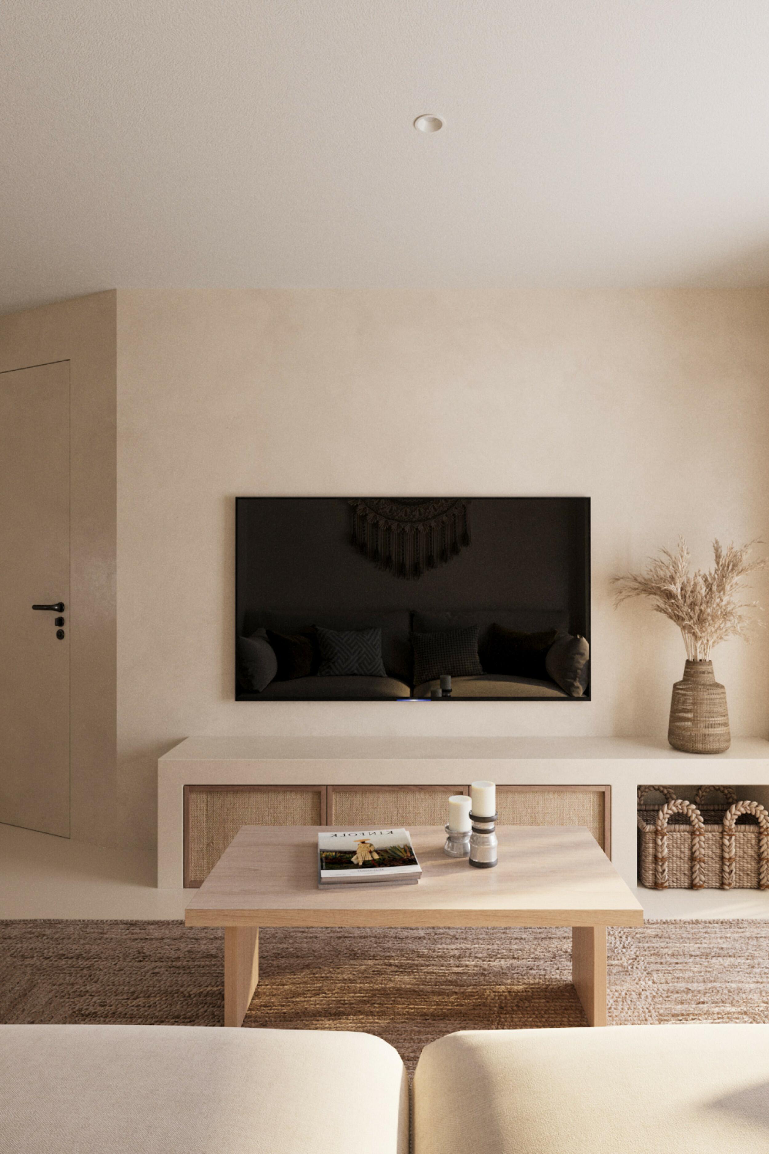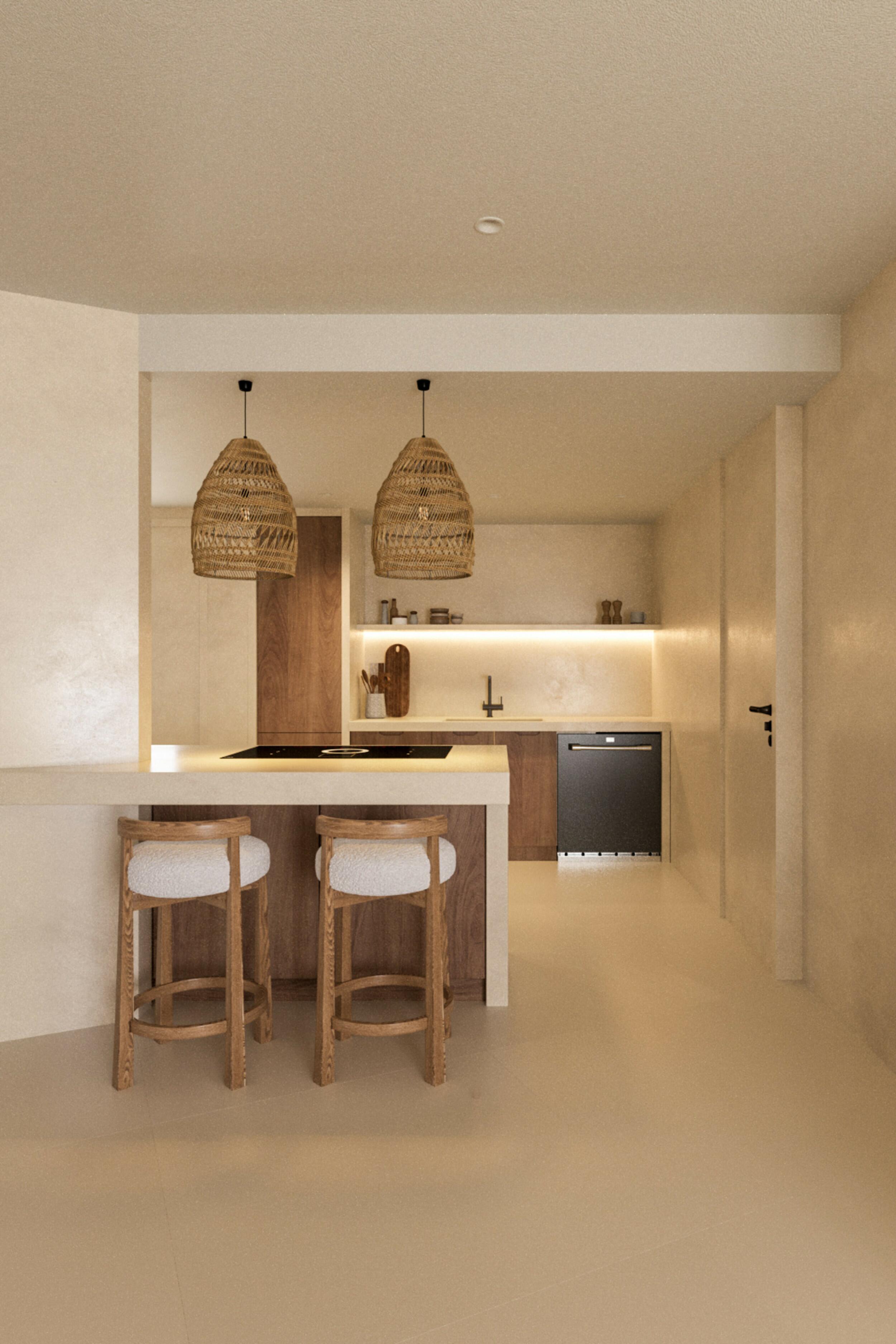 L'agencement intérieur a été soigneusement conçu pour maximiser l'espace et la lumière dans ses 65 m² de superficie construite. En entrant, vous êtes accueilli par un espace de vie moderne à aire ouverte où le salon se fond dans une cuisine entièrement équipée, comprenant un bar à petit-déjeuner accueillant. La chambre et la salle de bains sont discrètement positionnées à l'arrière de l'appartement, offrant intimité et tranquillité. La salle de bains dispose de finitions en microciment et d'une généreuse douche à l'italienne, tandis que la chambre dégage chaleur avec des éléments intégrés de bon goût et un éclairage d'ambiance.