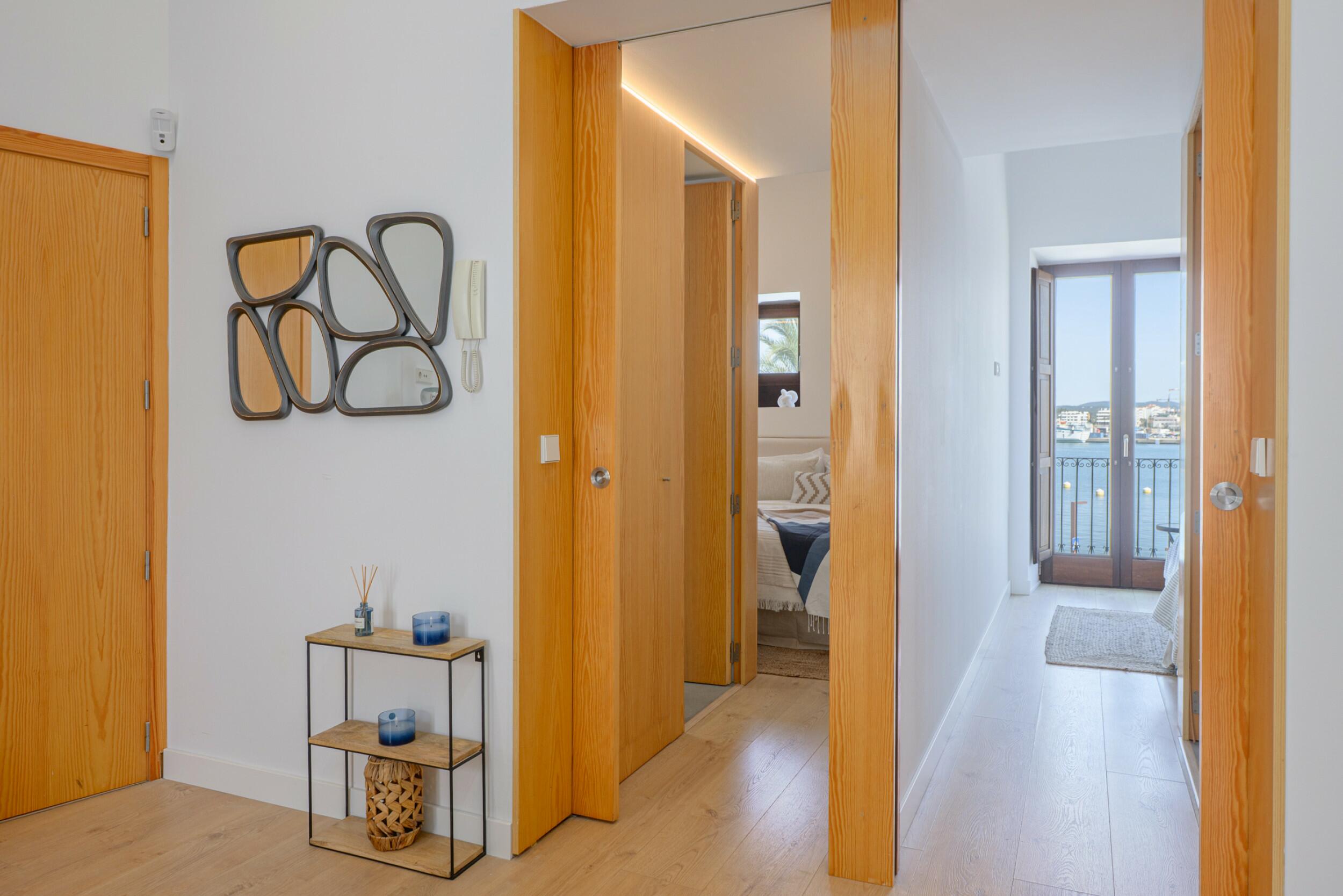La propriété offre environ 68 m² de surface construite. Elle s'ouvre directement sur un espace de vie, salle à manger et cuisine décloisonné, complété par une généreuse zone de rangement adjacente. La disposition comprend deux chambres, chacune avec sa propre salle de bains attenante. L'une des chambres dispose d'un accès à un balcon avec de belles vues sur le port.