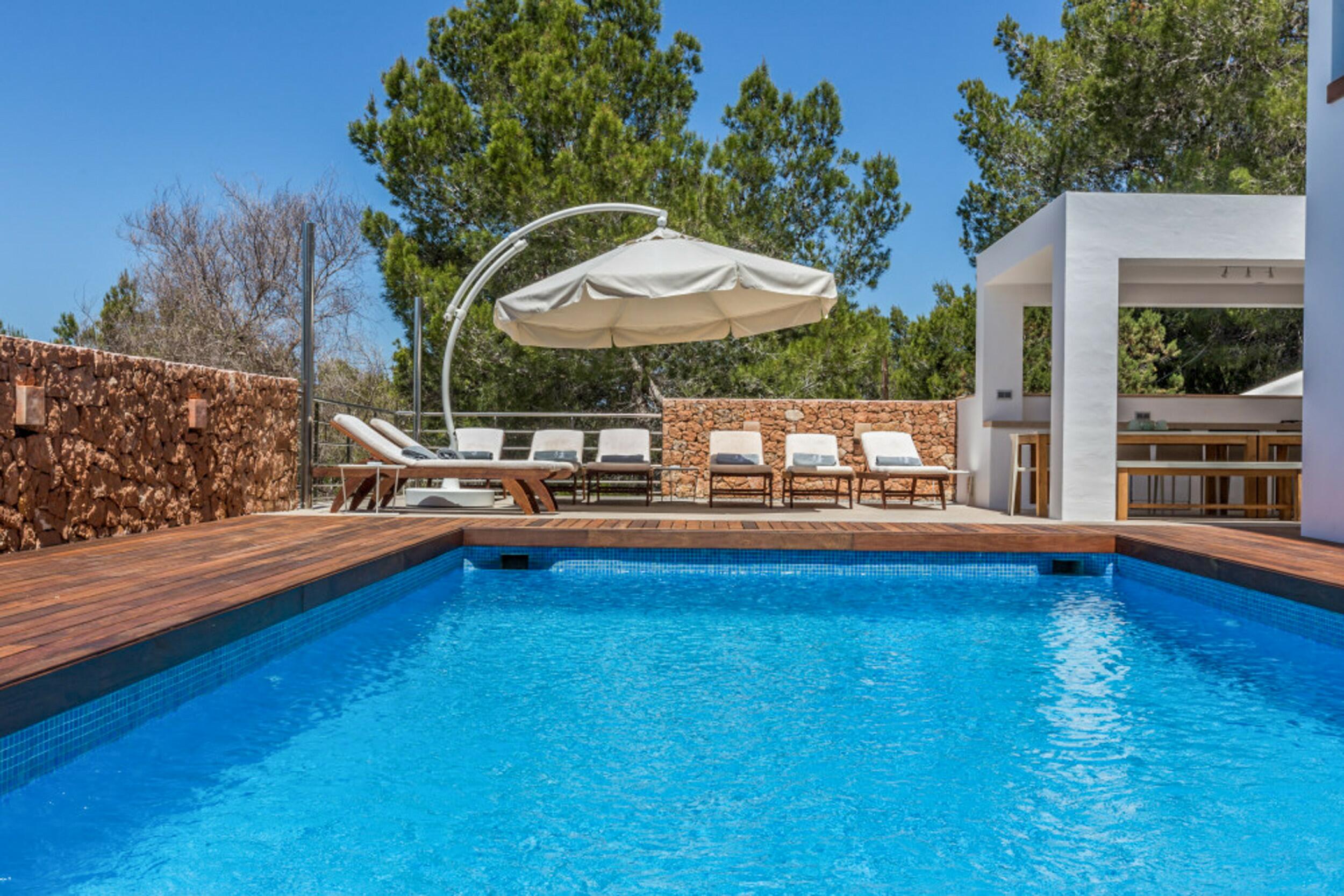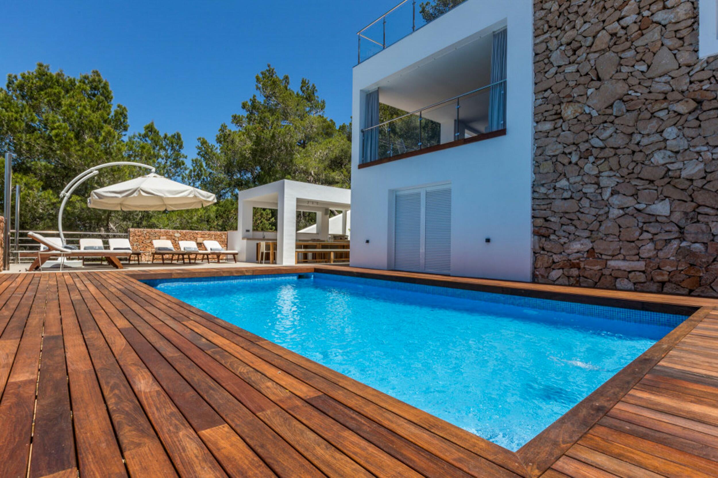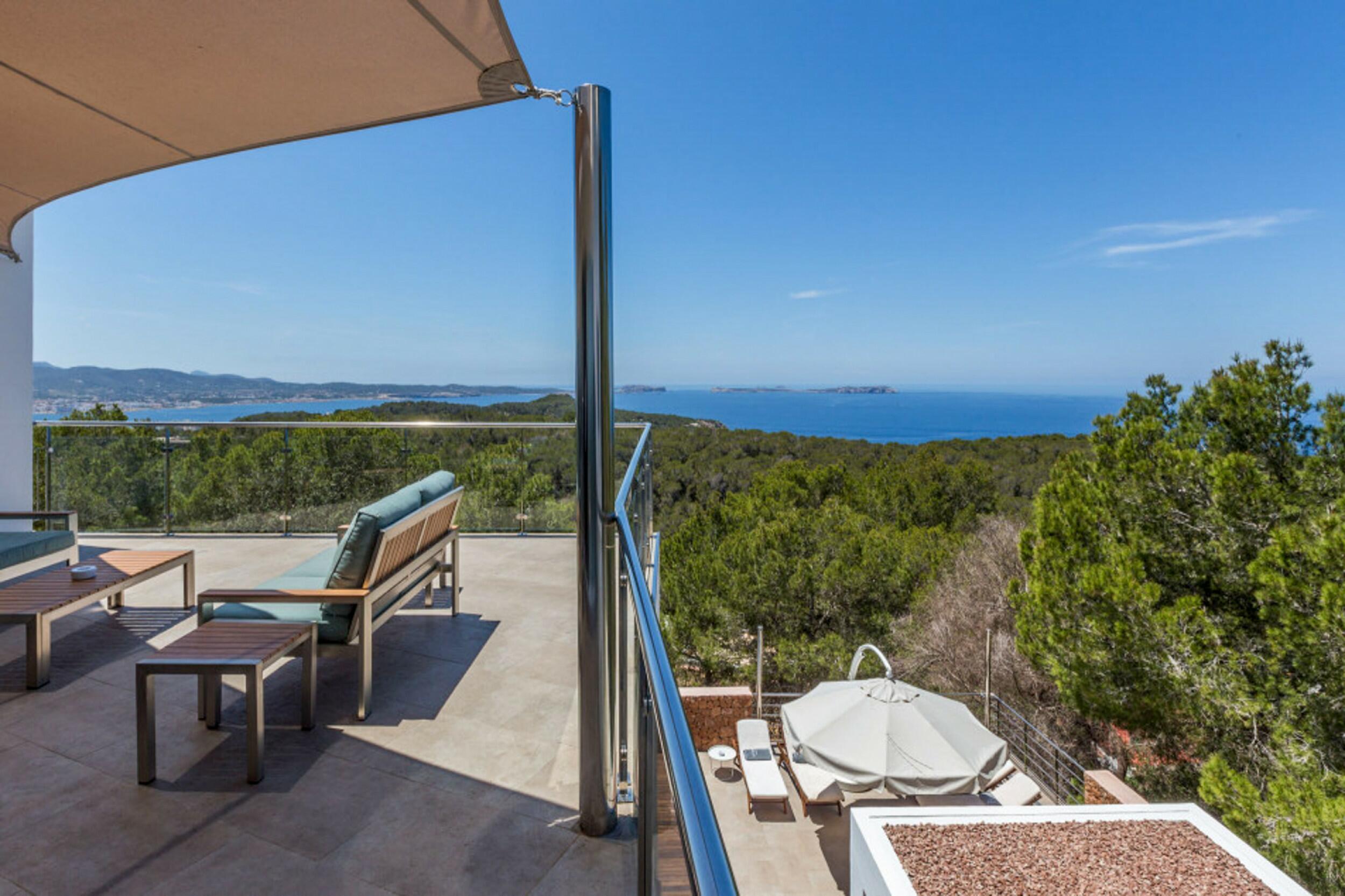Cette parcelle de 2 884 m2 avec une construction de 329 m2 est répartie sur trois niveaux avec une orientation orientée sud-ouest, ce qui garantit de nombreuses heures de soleil et des couchers de soleil toute l’année. Il est situé à seulement 6 minutes (en voiture) des plages de Cala Salada et Cala Gracio, à 20 minutes d’Ibiza et à 24 minutes de l’aéroport.