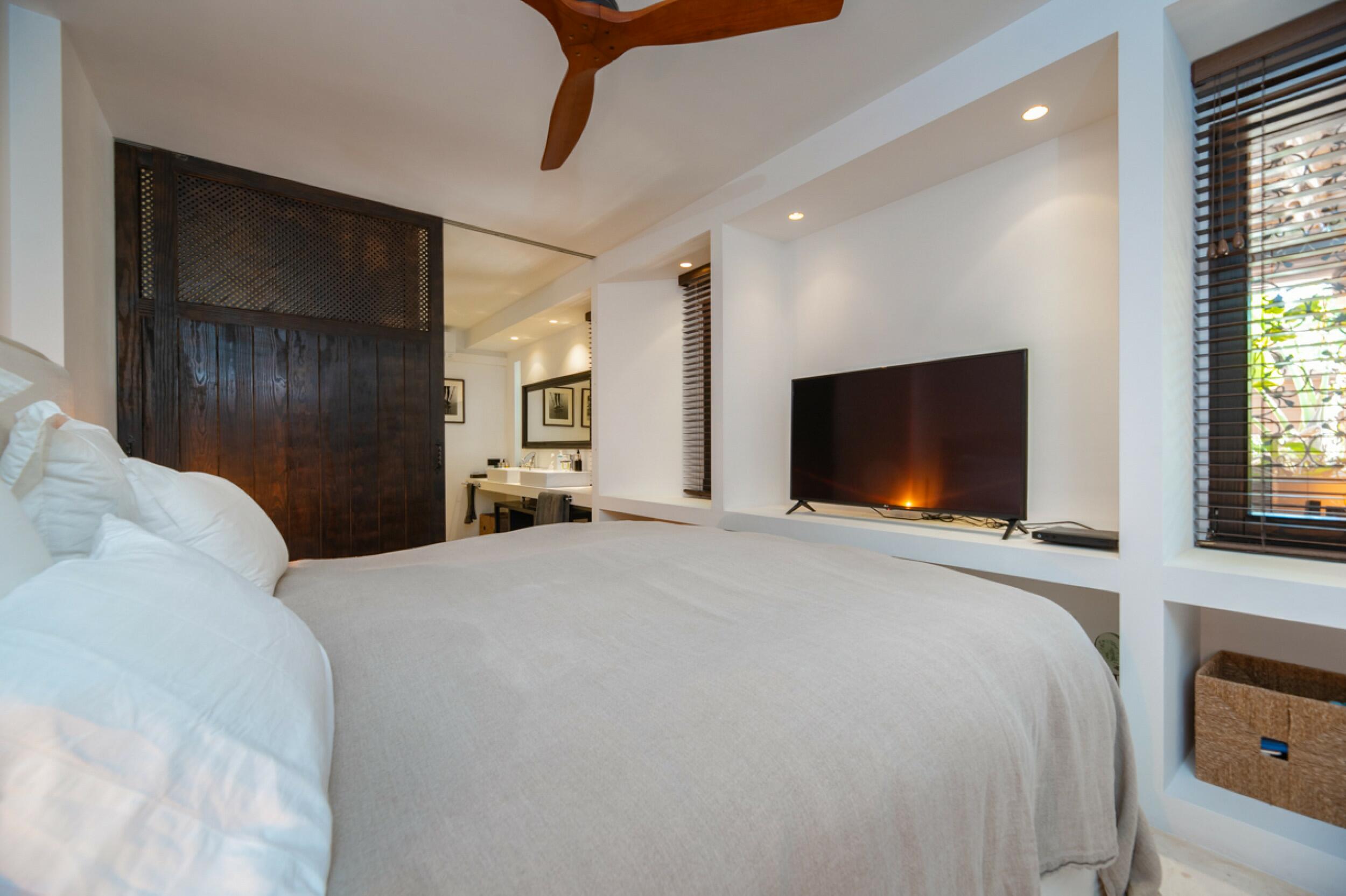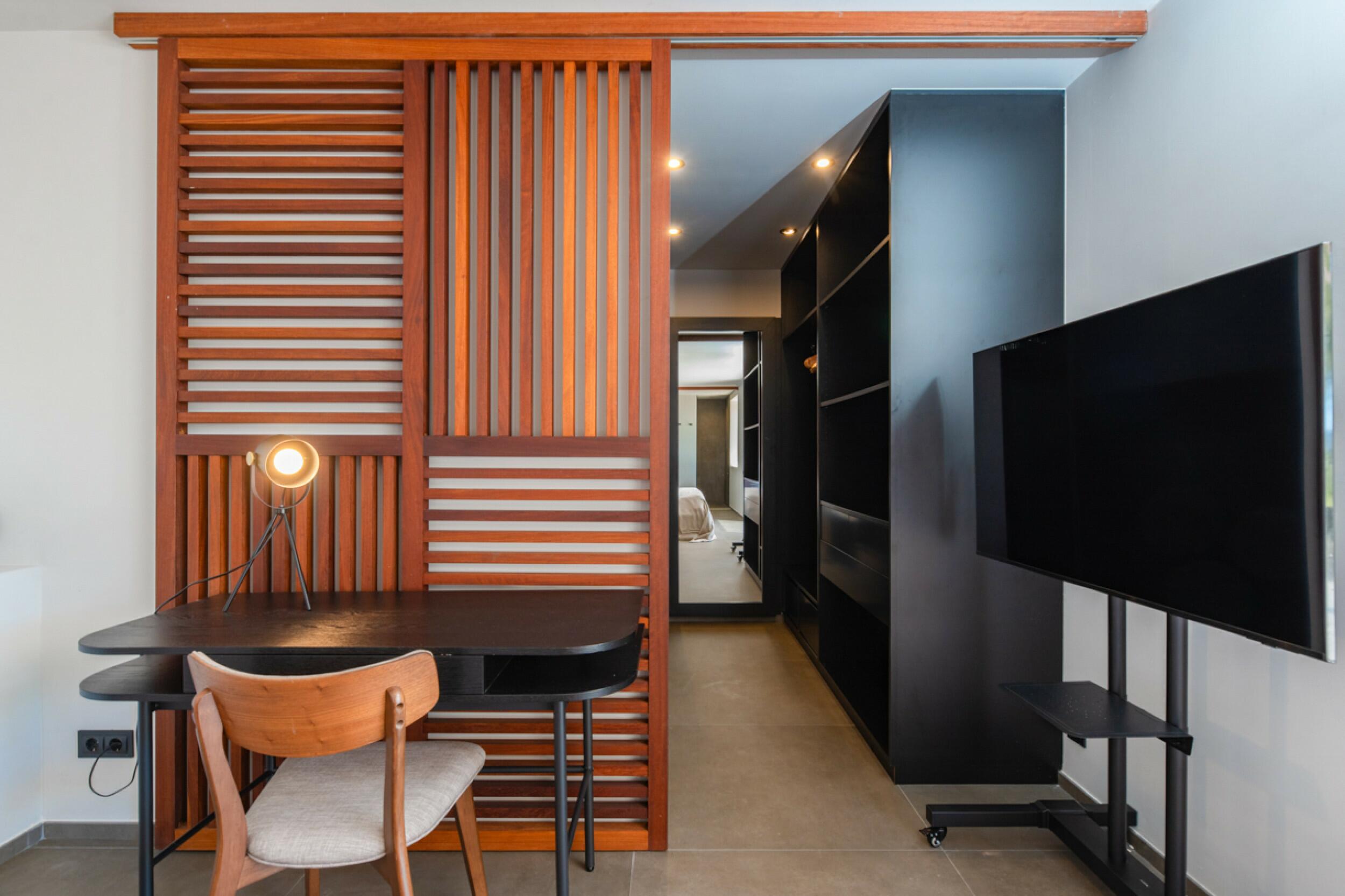Chambre principale avec dressing, coffre-fort, salon avec TV, salle de bain avec baignoire et douche, vue mer, accès terrasse.