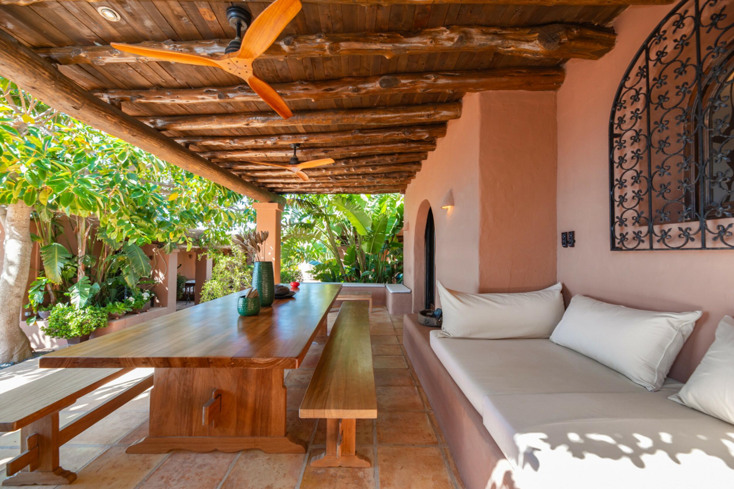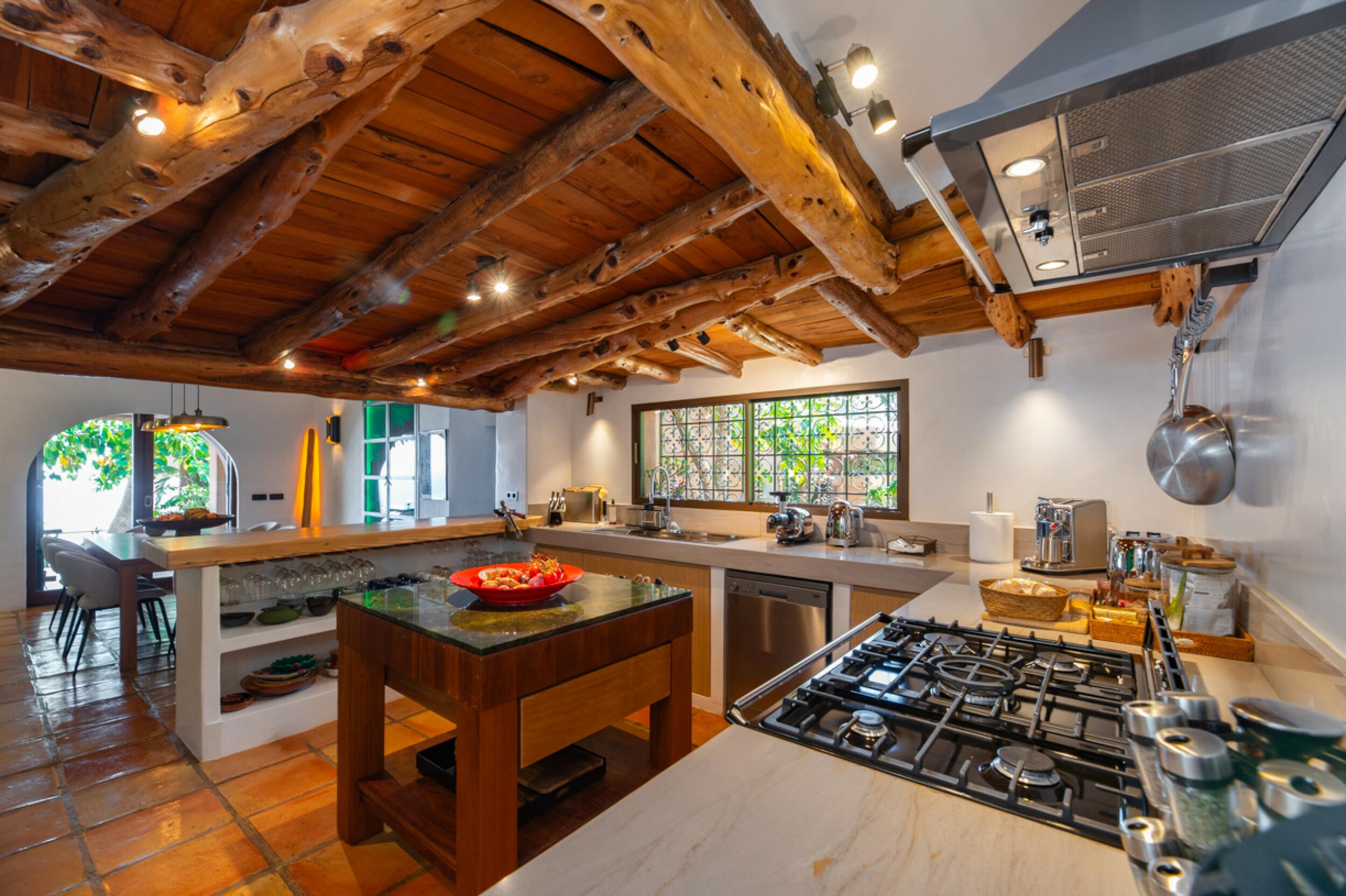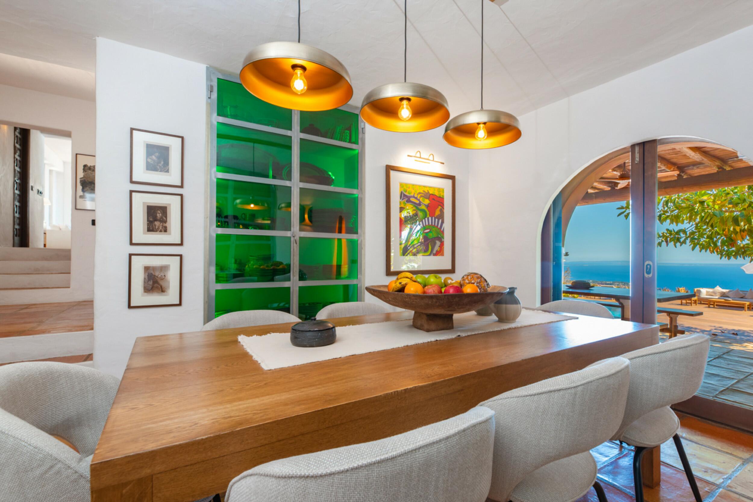 Une belle porte en bois sculpté constitue l'entrée de cette majestueuse villa, qui s'ouvre sur un très grand et lumineux espace de style loft avec le salon, la salle à manger et la cuisine, bordé de baies vitrées. Derrière se trouve une longue terrasse en bois offrant une vue somptueuse sur la mer.