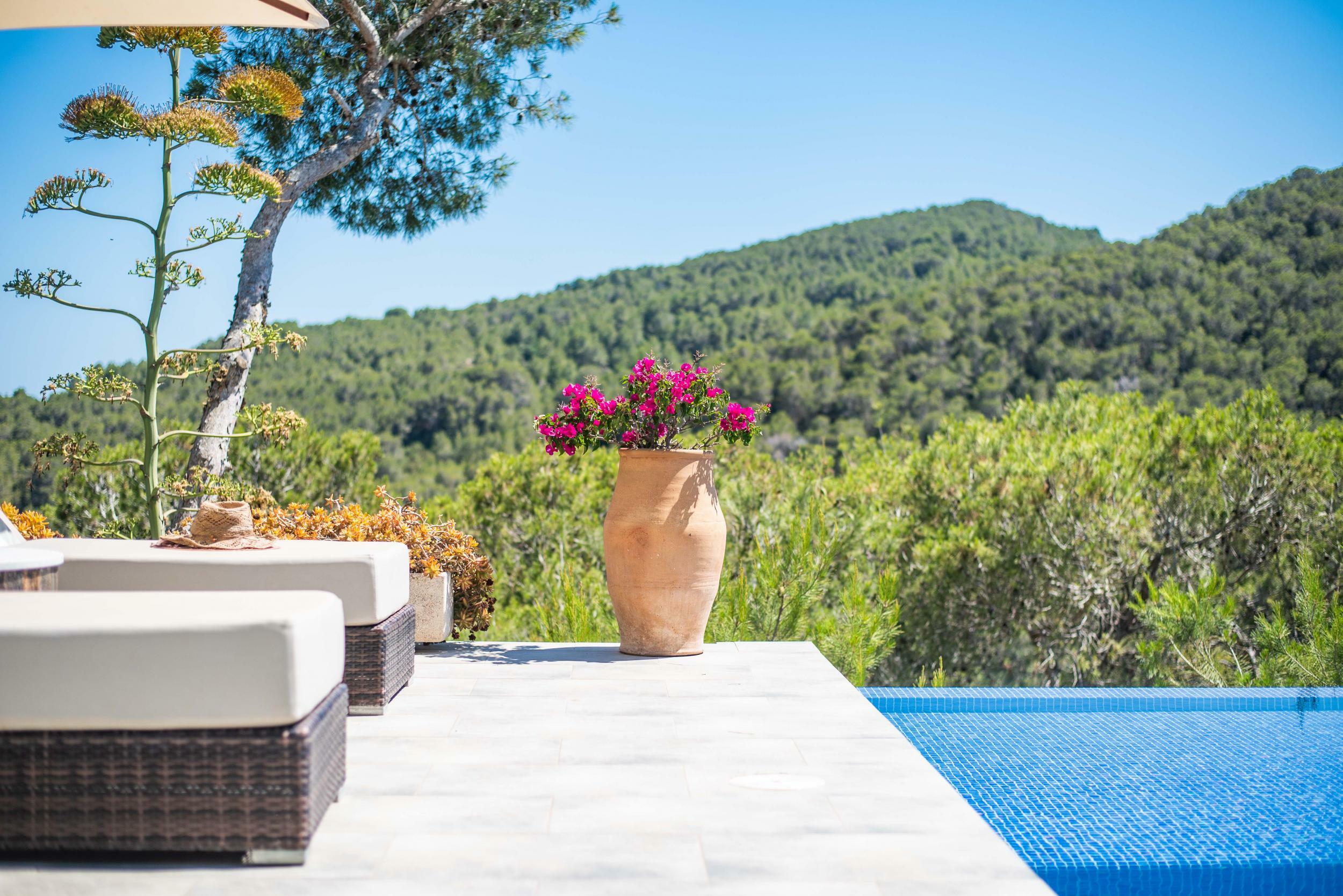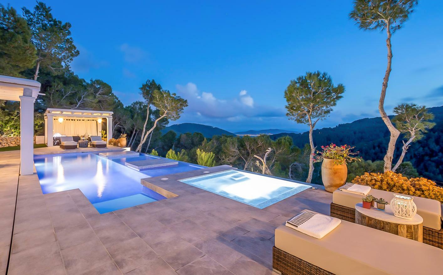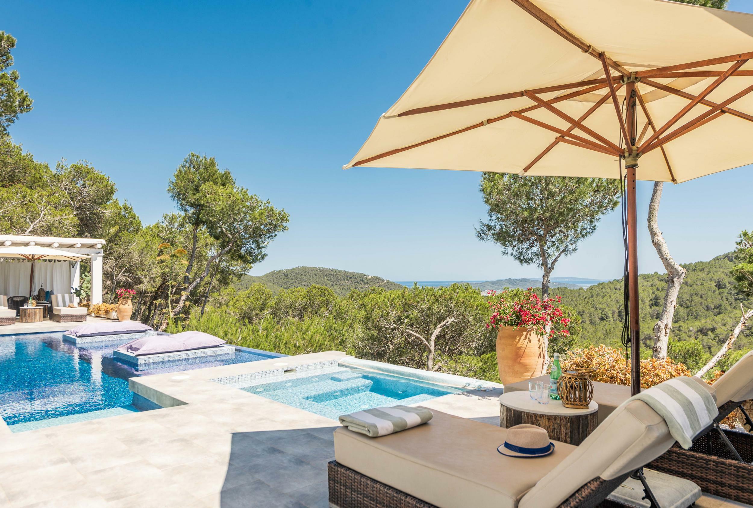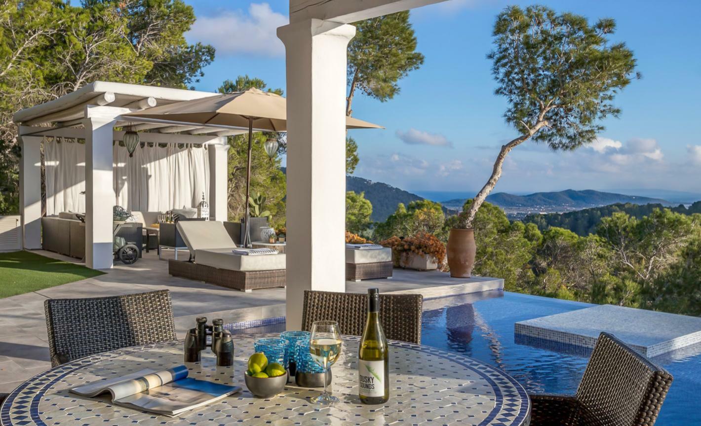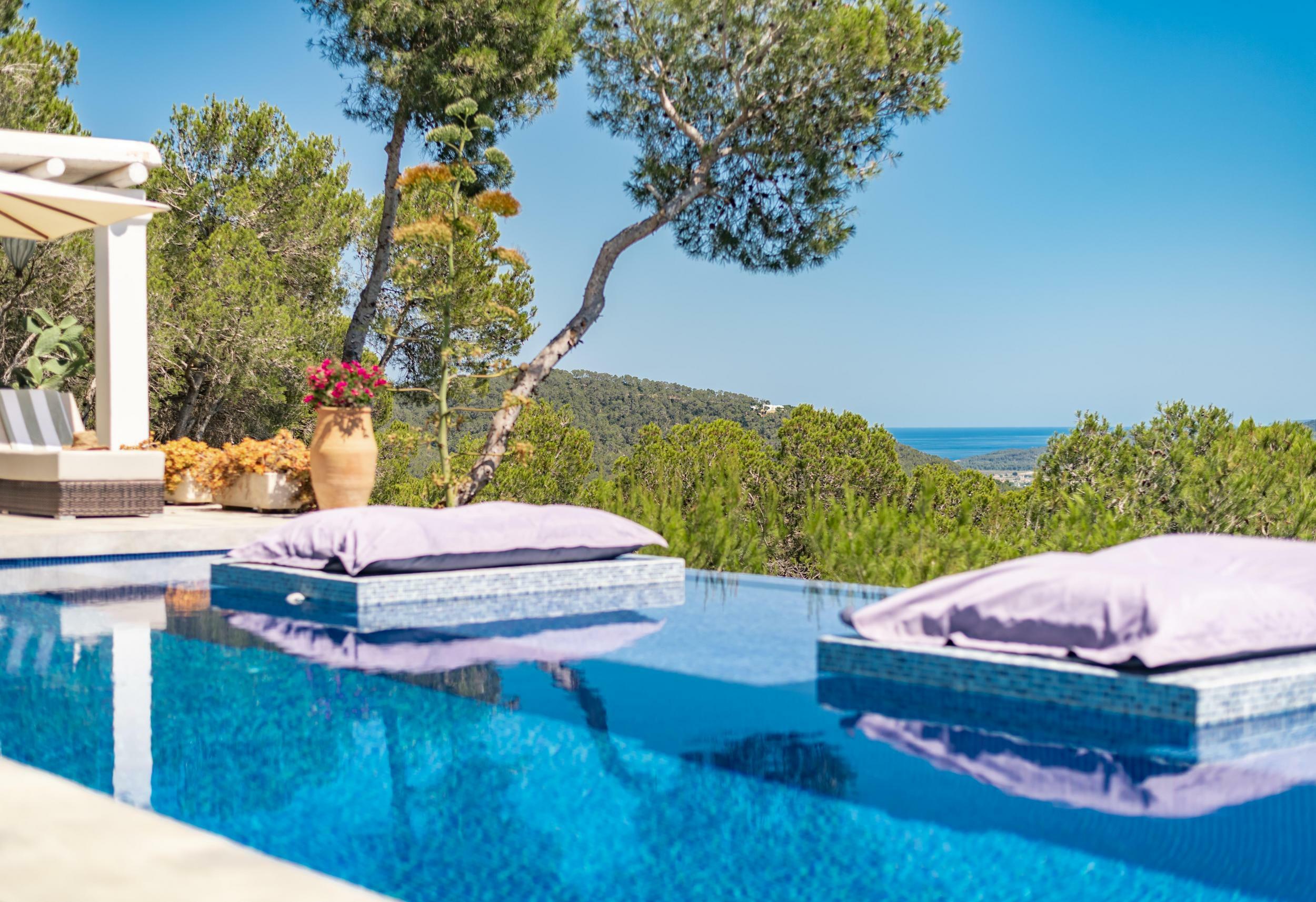 Villa moderne perchée à Ibiza avec piscine à débordement et vue sur les salines